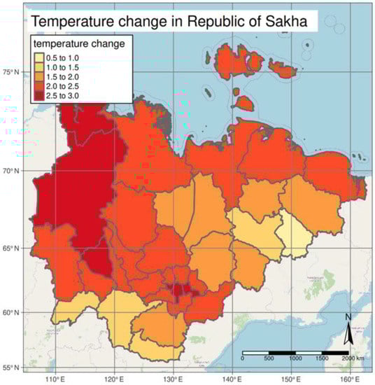 The difference in the average temperature (°C) between 1981–1982 and 2017–2018, for districts in the Republic of Sakha. Temperature was data obtained from ERA5 Climate Reanalysis. Darker red denotes a larger temperature increase.