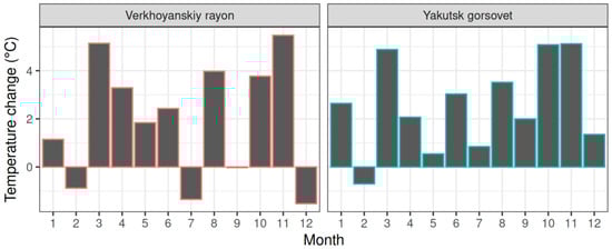 Changes in monthly temperature between 1981–1982 and 2017–2018, for the districts Verkhoyanskiy rayon and Yakutsk gorsovet in the Republic of Sakha.