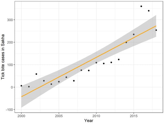 Aggregated at the republic level, the number of reported tick bite cases increased rapidly between 2000 and 2018 (Figure 1). A simple trend line reports an increase of 17.5 tick bite cases per year.