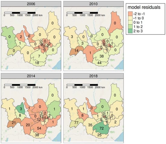 Figure 7 shows maps of the best fitting model’s residuals at 4 year intervals between 2006 and 2018. This was the model with year, average annual temperature and Selyaninov’s HTC as predictor variables. The maps suggest no persistent spatial pattern in the residuals that would indicate some important but unaccounted for spatial driver of tick bite cases.
