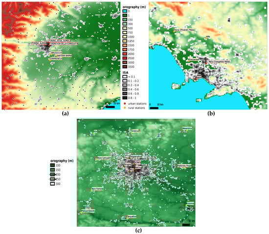The model validation for Naples has been carried out by using the hourly observational data provided by the Civil Protection network of Campania. In this domain, five stations were considered, two urban and three rural (Figure 1b). The urban ones are located in Naples and S. Marco Evangelista. The second one has been chosen in order to reduce the effects of the proximity to the sea with respect to Naples. They are both characterized by an impervious surface area above 0.60 (Table A2, Appendix B). The rural stations are chosen respectively in Grazzanise, Rocca D’Evandro and Alife. The simulated values used for validation purposes have been obtained for each station with a bilinear method.
