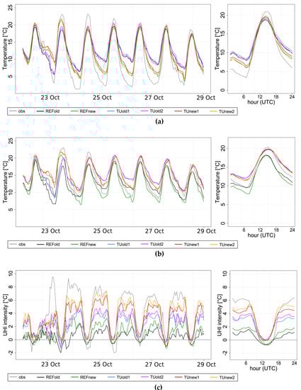 As in previous modelling studies for Moscow [,,], the model runs with TU nicely captures the dynamics of the air temperature in the city center, UHI intensity and its daily turn (Figure 8b,c). On the contrary, simulations without TU do not reproduce even a part of urban-induced temperature anomaly. The differences between UHI intensity in the runs with TU and different physical schemes are consistent with other regions, although the model sensitivity is less than for other study regions: the strongest UHI is experienced in TUnew2 run and the weakest in TUold1/2 runs. Not surprisingly, runs without TU provide the worst evaluation scores for temperature and UHI intensity for urban stations (Figure 9). Among the runs with TU, simulations with new turbulence provide the best scores during the most part of the day. TUnew2 simulation provides the best scores for UHI intensity at night and morning, since it is the only one which fully captures nocturnal maximum of UHI intensity (Figure 8c). However, this run performs worse in the evening (at 15–20 UTC) due to the phase shift between modelled and observed UHI daily cycle (Figure 8b). Such phase shift is also observed for Turin and may be associated with specific microclimatic features within the urban canopy layer, which remain unresolved in TU, as well with shortcomings the ABL scheme in the model.