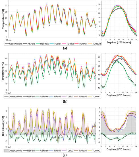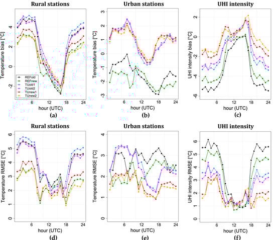 For the considered study period in June 2019, all model runs capture the basic patterns of the rural temperature dynamics, and a typical summer daily temperature cycle (Figure 8). As for other regions, the model overestimates nocturnal temperatures (at 0 and 21 UTC) in the runs with old physics, with worst MB more than 1.5 °C in TUold1 simulation (Figure 9). Simulations with old physics also demonstrate the highest daytime bias. The use of the new turbulence scheme and skin-layer temperature scheme decreases nocturnal temperatures and partially, but not fully eliminates positive nocturnal bias and improves RMSE (Figure 9a,c). It should be noted that model sensitivity to the change of physical schemes is smaller than for Turin and Naples, which may be associated with weather conditions or with flat terrain in the Moscow region, as well as with a larger number of rural weather stations used in analysis. Switching on TU scheme makes a small, but noticeable impact on rural temperatures since some rural stations are still affected by nearby settlements.