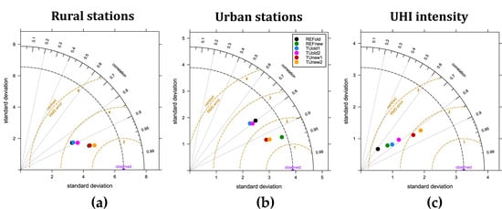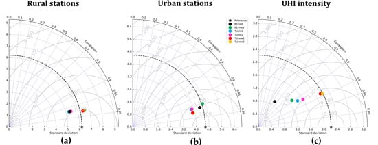 Taylor diagrams for rural stations (a), urban stations (b) and UHI intensity (c).