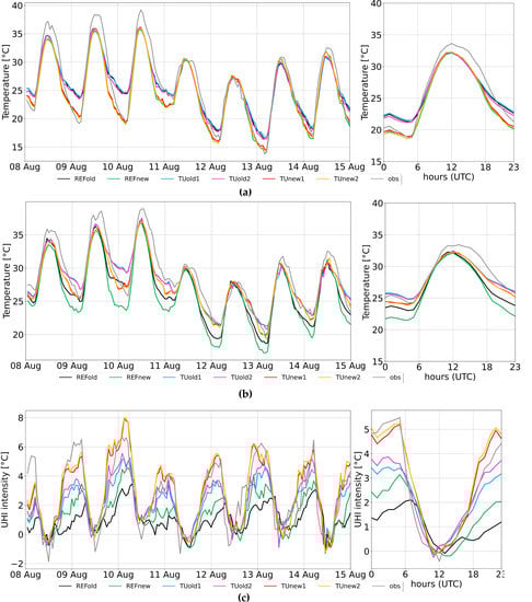 The T2m hourly values have been analyzed over the considered week and evaluated in their mean daily cycle. The behavior of the rural stations (average values among the three stations) is displayed in Figure 5a. The characteristic oscillating pattern reveals that, during daytime, peaks up to 38 °C are reached, while during the night the temperature decreases up to 18 °C. In general, this pattern is well captured by all the configurations, even if in the first three days maximum values are largely underestimated. The new turbulence scheme provides a sensible reduction of the minimum nocturnal values with significant performance improvement, as confirmed by MB and RMSE values for rural stations (Figure 6a,d). In rural sites, as expected, the activation of TU does not produce remarkable effects. On the other side, TU improves the representation of nocturnal values in urban stations, especially when the skin temperature scheme is activated. The hourly UHI intensity, calculated as the difference between the mean temperature urban value and the mean temperature rural value, is well reproduced when TU is activated (Figure 5), as confirmed by MB values less than 1.2 °C.