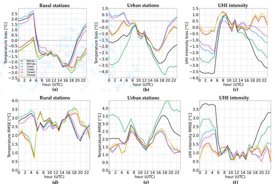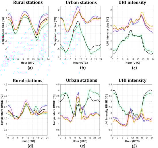 Mean biases and root-mean square errors of T2m, evaluated over rural (a,d) and urban (b,e) stations in the Campania study area; mean biases and root-mean square errors of UHI intensity for urban stations (c,f).