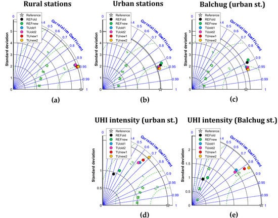 Taylor diagrams for 2-m temperature for rural (a), urban (b) weather stations and Balchug weather station in the city center (c), and for UHI intensity for urban weather stations (d) and for Balchug weather station in the city center (e).