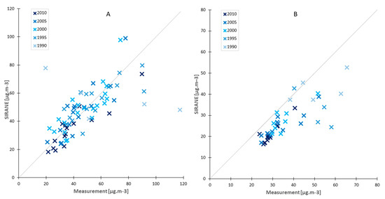 Concerning the systematic underestimate of PM10 concentrations, Nguyen et al. [45] pointed out the high contribution of the background to the PM10 concentrations (over 50%). By comparing the PM10 annual mean concentrations modelled with CHIMERE and measured at the Saint-Exupéry background monitoring station (available for 2005 and 2010, only), we observed that CHIMERE systematically underestimated measured PM10 background concentrations (Table 5). This may therefore explain the systematic underestimation of the PM10 annual mean concentrations.