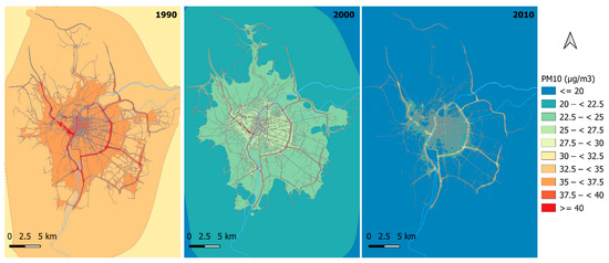 Evolution over time of annual mean PM10 concentration (µg/m3), with a 10 × 10 m resolution, in 1990, 2000 and 2010 in the LMA.