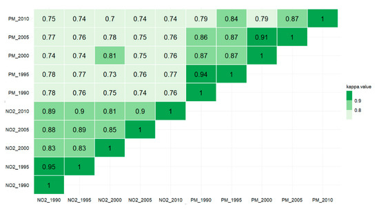 The analyses of the group classification agreement (Figure 7) also showed good results. For NO2, the agreement (kappa coefficients) between the years varied from 0.81 to 0.95, while for PM10, the values varied from 0.79 to 0.94 with only two pairs of years below 0.8 (1990 vs. 2010 and 2010 vs. 2000). A Kappa coefficient between 0.6 and 0.8 indicates a “strong” agreement between the two classifications, while a value above 0.8 indicates an “almost perfect” agreement. The agreement between the PM10 and NO2 group classifications varies from 0.70 to 0.81. For both pollutants individually, the weakest agreements were observed for the year 2000, whereas for the NO2 vs PM10 comparisons, the strongest agreement was observed in 2000.