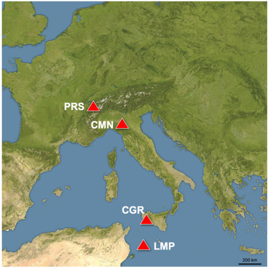 Geographical location of the measurement sites considered in this work. Plateau Rosa (PRS), Mt. Cimone (CMN), Capo Granitola (CGR) and Lampedusa (LMP).