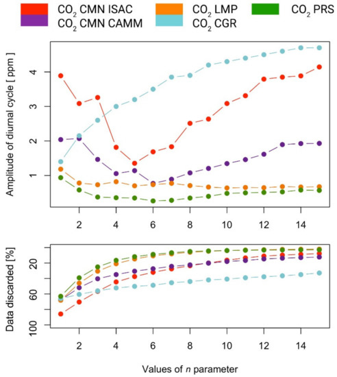 Results for CGR showed a different behavior with respect to the other datasets, with a somewhat larger daily cycle amplitude, and a fraction of rejected data which denoted only a limited dependency on the n value. Interestingly, differences were evident between CMN—CAMM and CMN—ISAC as concerning the dependence of the diel CO2 cycle amplitude and the fraction of data retained as “background” as a function of the adopted n values. This is related to the different temporal data coverages of these dataset. Indeed, the optimal value of n = 5 was obtained for both CMN—CAMM and CMN—ISAC when only data for one year (2018) were considered.