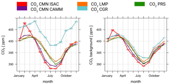 The differences among the different seasonal cycles were minimized after BaDS application (Figure 5, right). If we exclude the CMN—ISAC dataset, for which high values were still observed in January and February (even if notably reduced in respect to the original dataset), the differences between the different measurement sites are reduced to 2.5 ppm (from October to March) and to less than 1 ppm (July). In particular, the decreasing phase of the annual cycle from April to August was similar for all sites, with the CMN dataset approaching PRS and LMP. The outstanding agreement of the CGR background to the other sites demonstrates the ability of the BaDS algorithm to extract the background signal even if the measurement site was strongly impacted by local/regional emissions.