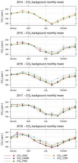 Figure 4 shows the CO2 monthly mean time series at the different sites from 2014 to 2018 by considering the original datasets, and the monthly time series of the background CO2 dataset, as obtained by the BaDS application. Apart from the multi-year increasing tendency, the seasonal variations of CO2 through the years is evident, with maxima in the first months of each year, a minima during summer, and an amplitude of the annual cycle of about 10–15 ppm, depending on the year and the measurement site. The seasonal CO2 cycle was a combination of different contributions: biosphere emission and removal processes, anthropogenic emissions and atmospheric transport (on different temporal and spatial scales).