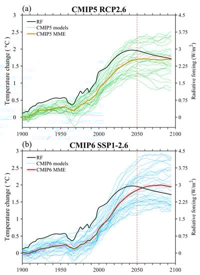 The model outputs from simulations of historical period and future low-emission scenarios, RCP2.6 and SSP1-2.6 [,], are analyzed in the present study. The model outputs analyzed in the present study are all based on global earth system models or climate models. In both RCP2.6 and SSP1-2.6, RF is prescribed to first increase to a peak around 2045 and then decrease (Figure 1, black lines). During 2050–2100, the multi-model ensemble mean (MME) global mean surface temperature (GMST) change is weak, the GMST trajectory holds nearly flat in CMIP5 and slightly increases in CMIP6 []. Note that there is pronounced differences in the GMST responses between CMIP5 and CMIP6, possibly due to differences in models’ climate sensitivity to external forcing like greenhouse gases and aerosols and cloud simulations [].
