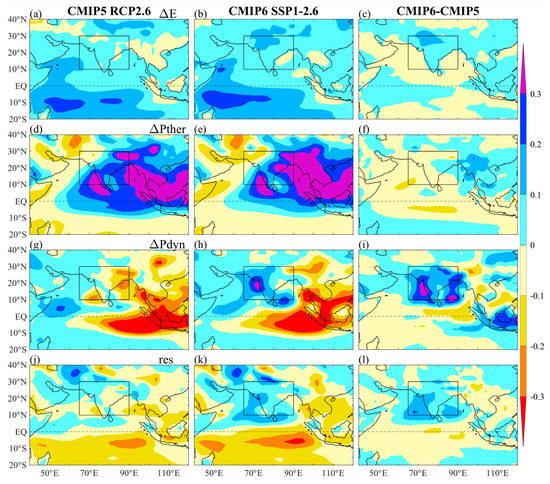 Subcomponents of MME ISM precipitation change (mm day−1): (a–c) evaporation change (, mm day−1), (d–f) thermodynamical component (, mm day−1), (g–i) dynamical component (, mm day−1) and (j–l) residual term (, mm day−1) under RCP2.6 in CMIP5 and SSP1-2.6 in CMIP6 and their differences.