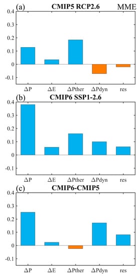 The  denote the future change, , , , , and  are precipitation, evaporation, the thermodynamical component due to moisture change, the dynamical component due to atmospheric circulation change and the residual term, respectively. In the tropics, the thermodynamical and dynamical components can be well approximated as [,,,]: