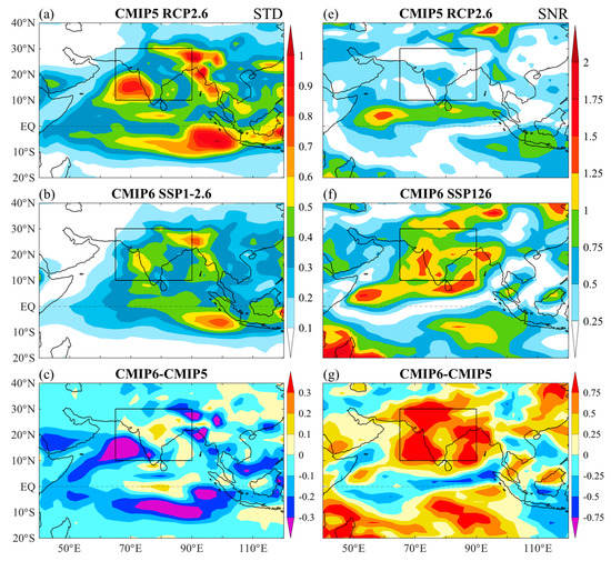Intermodel standard deviation (STD, mm day−1) of precipitation change under (a) RCP2.6 and (b) SSP1-2.6 and (c) their differences. Signal-to-Noise ratio (SNR) of the MME precipitation change under (e) RCP2.6 and (f) SSP1-2.6 and (g) their differences.