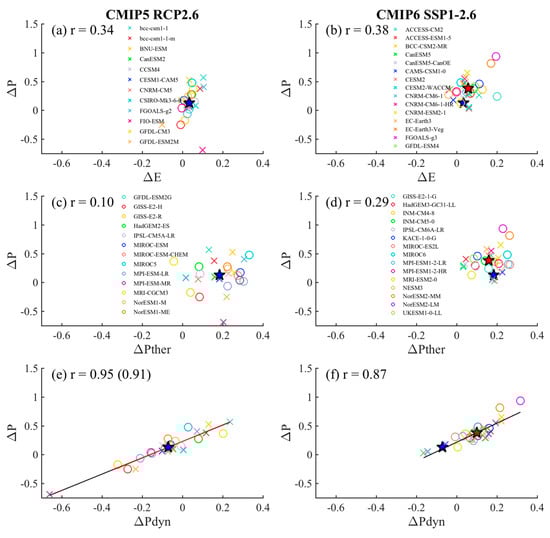 High model uncertainty indicates large intermodel spread but cannot explain what causes the spread across models. The intermodel correlation analyses can throw light on the relationship of relevant processes that may produce the model-to-model differences. Figure 9 shows the intermodel relationship between ISM precipitation change and its components in RCP2.6 and SSP1-2.6. The correlation coefficient is relatively low between precipitation change and evaporation change and thermodynamical component (Figure 9a–d), suggesting that them explain a small portion of the intermodel variance in ISM precipitation change. In contrast, the dynamical component displays a high correlation coefficient (above 0.85) with ISM precipitation change in both RCP2.6 and SSP1-2.6. Therefore, the intermodel differences in the dynamical component dominates the intermodel variance in ISM precipitation change. Moreover, the thermodynamical component (evaporation change) promotes ISM precipitation increase in all (most) models (Figure 9a–d), while the dynamical component strikingly differing in its sign across models (Figure 9e,f). In CMIP5, more than two thirds of models (19 out of 25) project that the dynamical component dampens the ISM precipitation. In contrast, the dynamical component promotes ISM precipitation in nearly two thirds of models (22 out of 30) in CMIP6. This leads to a reversion of the MME dynamical component from drying effect in CMIP5 to wetting effect in CMIP6 on MME ISM precipitation. Moreover, the intermodel spread in the dynamical component mainly follows that of the ISM circulation change, with intermodel correlations coefficients up to nearly 1 in both RCP2.6 and SSP1-2.6.