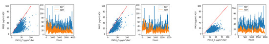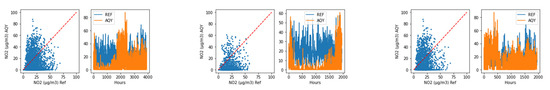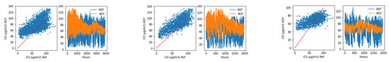 Figure 1, Figure 2 and Figure 3 and Table 3 display the performance of the microsensor against the reference station instruments. Regarding the full time series data (left), out of the three pollutants, NO2 demonstrated the worst performance, with negative coefficient of determination and almost zero correlation. Ozone (O3) had a moderate correlation R but very low coefficient of determination. For PM10 we could see a slightly higher R, even though R2 was negative [27]. Both O3 and PM10 exhibited drifting behaviors as time passed, leading to further underestimation. Regarding all three pollutants, the measurements were scattered far from the regression line (red line). Lastly, the values of MAE and RMSE indicated over 15 and 17 μg/m3 average errors for all pollutants, respectively.