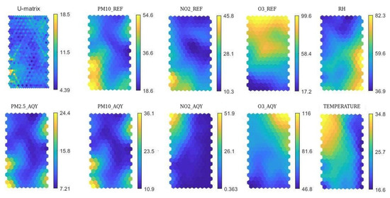 To further investigate the performance of the AQY device, we compared the SOMs for each pollutant, as is shown in Figure 4. Comparing the NO2 REF map with the NO2 AQY map reflects the inconsistency of the measurements of the AQY device. While the first shows high values on the left lower region, the latter shows high values at the upper left region. Regarding O3, the two maps show overlapping regions for high and low values. Even though the region in which the two maps differ corresponds to high temperatures, which favors the production of ground level O3, this is reflected only on the reference measurements. Finally, the PM10 REF, PM10 AQY and PM2.5 AQY show the same patterns across their maps; however, the different range of the values confirms that the AQY device underestimated the PM10 levels.
