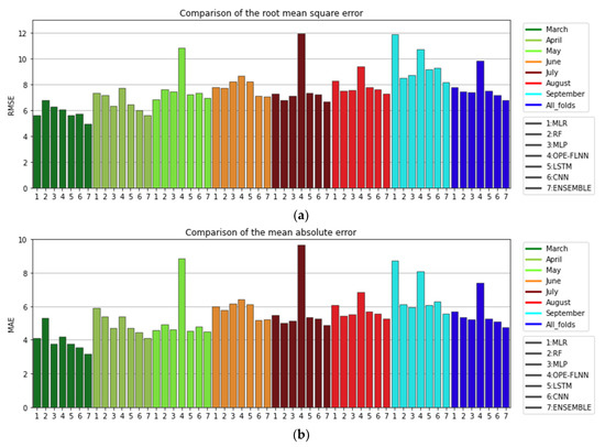The statistical indices for the evaluation are presented in Figure 5. Overall, the calibration was successful in significantly improving the coefficient of determination from −1.28 to the range (0.557 to 0.818) for all the months except September, where the best individual model yielded R2 = 0.298. The standard calibration method MLR was outperformed in most cases, except for May, where MLR yielded R2 = 0.63 and MAE = 4.579. The best results overall were obtained for April by the CNN model, with R2 = 0.818 and MAE = 4.467. Additionally, the CNN model yielded the best results for June, with R2 = 0.603 and MAE = 5.159. The LSTM model outperformed the CNN model for March in terms of R2 and RMSE, but displayed lower MAE than the CNN. Regarding July and August, the RF algorithm was preferred, with R2 = 0.557 in both cases and MAE = 5.015 and MAE = 5.441, respectively. RF also had the highest R2 and the lowest RMSE (= 8.503) for September, as mentioned above, but MLP had the lowest MAE (= 5.943); thus, the best model could not be determined with these indices alone. Lastly, the MLP architecture performed quite well and was stable for all months and approaches; however, it never outperformed the other (best) models. Averaging the predictions from the best models for each month consistently reduced the error metrics and improved the coefficient of determination 2–7%, except for May and June, where there was no gain from averaging. Finally, the drifting behavior of the AQY device measurements was reflected by the ability of the models to reconstruct the PM10 levels. It is expected that the information content of input variables was not evenly distributed among the time interval of investigation. Thus, for example, in the first two months, AQY demonstrated good performance in terms of O3 against reference measurements, and therefore relevant models were expected to benefit from such an agreement.