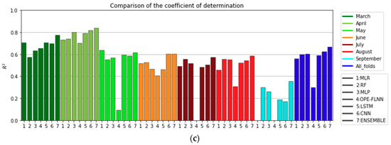 (a) RMSE, (b) MAE and (c) R2 metrics of all the models and their average ensemble. The colors denote the month in which the models were evaluated, and the numbers (1–7) refer to the algorithm used. The All_folds corresponds to the aggregated metrics on the whole dataset.