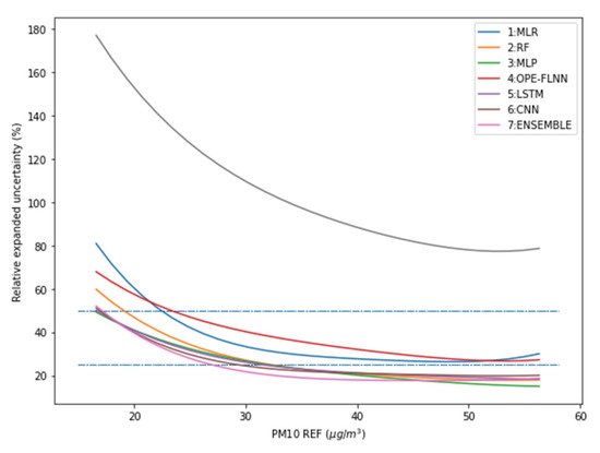 In order to evaluate the capability of the computational calibration methods to improve the operational performance of the AQY device for PM10 monitoring, the relevant uncertainty was calculated on the basis of the methodology described by [24] and making use of Equations (2) and (3).