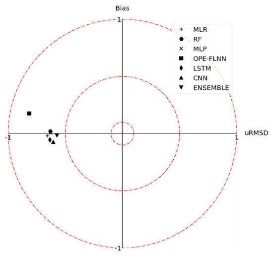 The target diagram [23] is derived from the equation RMSE2 = B2 + uRMSD2. Since the relationship of the statistics obeys the Pythagorean theorem, the target diagram is placed on a Cartesian plane where the x-axis represents the uRMSD and the y-axis represents the bias. The error performance as quantified by the RMSE, is represented as the distance from the origin. The normalized target diagram can be plotted when B, RMSE, and uRMSD are normalized with the reference instrument standard deviation. Models within the target circle of unit radius are better predictors of the reference measurements than mean concentrations represented by the circle. In this study, we used the normalized target diagram in order to compare all the calibration techniques that we employed in terms of RMSE.