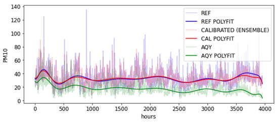 As can be seen in Figure 6, the initial PM10 measurements of AQY never reached an uncertainty below 75%, while they should be below 50% to be considered as compliant with the Data Quality Objectives (DQO) imposed by the European Air Quality Directive (AQD) for indicative measurements. However, the post-calibration measurements were well below the DQO limit for all the models. Furthermore, the uncertainty from the RF, MLP, LSTM, CNN, and AVG models dropped below 25%, which corresponds to the DQO limit for fixed measurements. The average performance of the models is depicted in Figure 7. All models except OPE-FLNN, which showed poor performance, were close to one another, with the best being the CNN neural network, with R2 = 0.624, RMSE = 7.2 and MAE = 5.07. The averaging of the model predictions outperformed the CNN architecture, with R2 = 0.667, RMSE = 6.77 and MAE = 4.76. In Figure 8, the calibrated output is compared with the reference and the sensor uncalibrated output. A 15th degree polynomial is fitted to clearly demonstrate the improvement of the calibration method.
