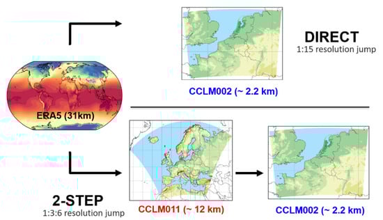 - Brisson, E.; Demuzere, M.; van Lipzig, N.P.M. Modelling strategies for performing convection-permitting climate simulations. Meteorol. Z. 2016, 25, 149–163. [Google Scholar] [CrossRef]