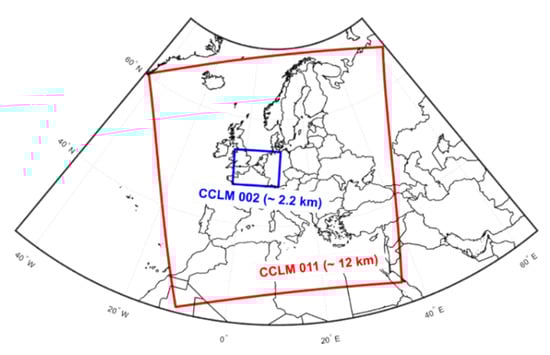 The optimized COSMO-DE setup is adopted for both CCLM002 experiments. It results from the protocol established in the frame of the Coordinated Downscaling Experiment (CORDEX) [,] of the World Climate Research Programme (WCRP) for the Flagship Pilot Study (FPS) on convection [] focusing on the investigation of convective-scale events in a few key regions of Europe and the Mediterranean basin with convection-permitting regional climate models. Regarding the intermediate simulation (Table 1), it is run with COSMO-CLM over the common domain (Figure 2) investigated within the European branches of the CORDEX, acknowledged as EUROCORDEX []. The same setup as in EUROCORDEX is adopted for COSMO-CLM at 0.11°. All the configurations reported in Table 1 do not include the spectral nudging.