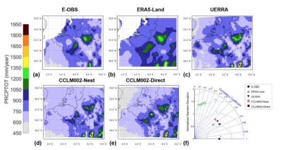 Spatial distribution of yearly average PRCPTOT over 2007-2011 for E-OBS (a), ERA5-Land (b), UERRA (c), CCLM002-Nest (d), CCLM002-Direct (e), with associated normalized Taylor diagram statistics (f) assuming E-OBS as reference.