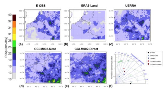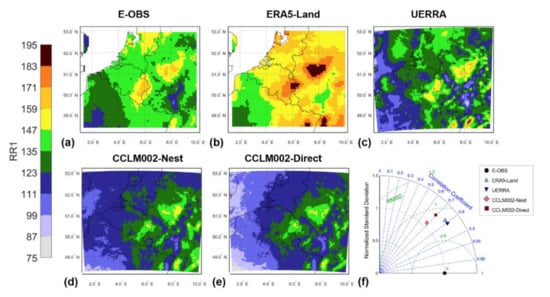 Spatial distribution of R95p over 2007–2011 for E-OBS (a), ERA5-Land (b), UERRA (c), CCLM002-Nest (d), CCLM002-Direct (e), with associated normalized Taylor diagram statistics (f) assuming E-OBS as reference.