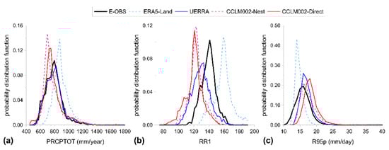 Probability Distribution Function of PRCPTOT (a), RR1 (b), and R95p (c).