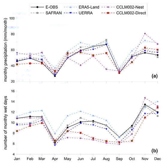 From an operational viewpoint, the mean annual cycles of monthly precipitation and monthly number of wet days are averaged over the city domain (Figure 3b) to obtain a single time series. It is noteworthy to remark that E-OBS surely represents a consolidated reference for Germany cities as they are widely covered by the ECA&D network station; the same is not for the French cities for which the available observed data are more limited [,].