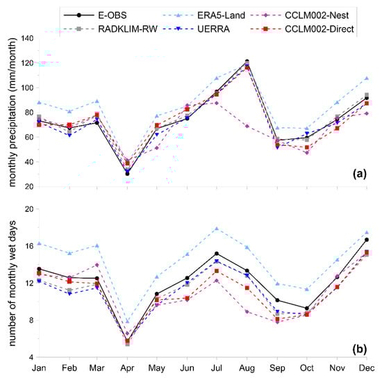Multi-year cycle of (a) monthly PRCPTOT and (b) monthly RR1 for Cologne (DE) yielded by ERA5-Land, UERRA, CCLM002-Nest, CCLM002-Direct assuming E-OBS and RADKLIM-RW as references.