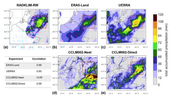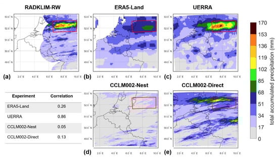 Spatial distribution of accumulated precipitation over the evaluation domain yielded by RADKLIM-RW (a), ERA5-Land (b), UERRA (c), CCLM002-Nest (d), and CCLM002-Direct (e) for the Event 1 (20 August 2007 06:00 UTC–23 August 2007 06:00 UTC). The red box indicates a specific area of interest. The table reports the spatial correlation computed for the specific area of interest, assuming RADKLIM-RW as reference.
