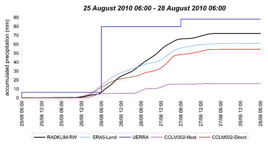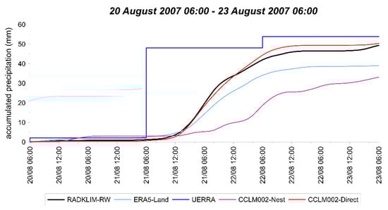 This time, both ERA5-Land and CCLM002-Direct anticipate the accumulation, returning an underestimation in terms of total accumulated precipitation with respect to RADKLIM-RW. Conversely, UERRA overestimates the observed total accumulated precipitation (~90 mm for UERRA against ~70 mm for RADKLIM-RW). Finally, CCLM002-Nest is completely unsuitable in reproducing such an event.