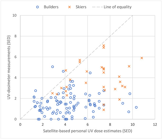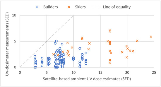 Figure 2 shows that such estimates come much closer to the values measured by dosimeters. For the two skiers mentioned above, the modelled ER is 0.44, and so the dose of 7.1 SED is very close to the satellite-based estimate of 7.4 SED. This suggests that the individual factors are consistent with the scenario described by the ER model—the skier did not spend much time with their forehead shaded (i.e., due to shade-seeking behaviour) and their dosimeter likely was not significantly affected by measurement errors. On the other hand, the dose of 0.9 SED is so far below the satellite-based dose estimate that individual factors such as shade-seeking behaviour are probably not sufficient to explain such a low dose—a more likely explanation would be that the dosimeter was poorly mounted and being blocked by headgear or potentially malfunctioning. This is information that could not be gleaned without the inclusion of ER modelling in the satellite-based dose estimate and it is important for public health researchers who would attempt to use such measurements to make inferences about population exposure (in this case, specifically the skiing population). Importantly,