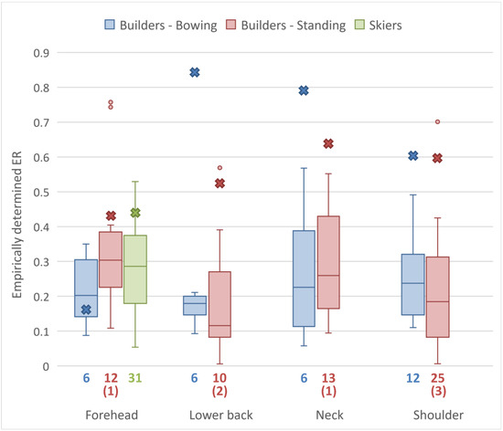 Figure 3. We see that there are large ranges of ERs in each case, except the foreheads and lower backs of construction workers with a predominantly bowing posture. However, both of these exceptions are based on just 6 measurements each, and so coincidence cannot be ruled out. For the purposes of comparison,