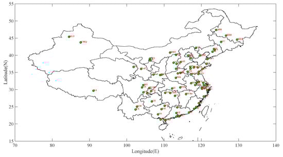 The computing area and the locations of the 80 sample cities during the experimental period. Full names of these cities can be found in [].