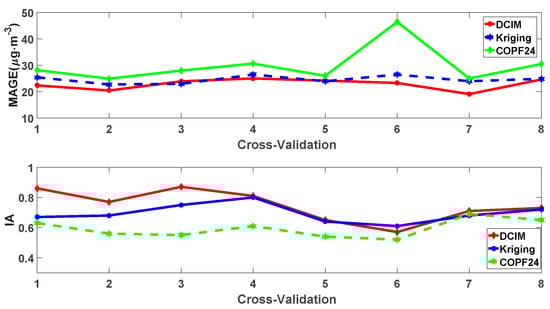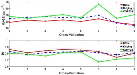 The comparison results of different methods were illustrated in Figure 2 (Interpolation errors in checked samples of different methods for the 8-fold cross-validation experiments) and Figure 3 (Scatter plots and performance of different methods for the 8-fold cross-validation experiments). As shown in Figure 2, the MAGEs and IA of the DCIM were lower than those of kriging interpolation and COPF24 in most of the cross-validation processes except for PE_7 and PE_8. The interpolation errors of kriging interpolation were larger than those of the COPF24 in most of the cross-validation processes except for PE_8. As illustrated in Figure 3, the averaged MAGEs of the DCIM, kriging and COPF24 were 21.93, 24.15 and 25.92 μg·m−3, respectively. The averaged IAs in checked samples of the DCIM, kriging and COPF24 were 0.80, 0.79 and 0.51, respectively. In summary, multiple runs produced similar results, with little difference.