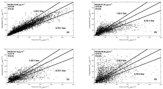 Figure 3 illustrates the scatterplot that compares the performance of different methods for the 8-fold cross-validation experiments on 8–11 November 2014. The 1.25:1, 1:1 and 0.75:1 lines are shown for reference. According to the validation scatter plots shown in Figure 3, the DCIM captured 72.91% of the observations in the checked samples within the 1.25:1 line and the 0.75:1 line, which verified the usefulness of the DCIM on PM2.5 simulations. The kriging interpolation and the COPF24 captured 72.83 and 69.60% of the observations, respectively. Meanwhile, the DCIM captured 78.89% of the observations in the interpolation samples within the 1.25:1 line and the 0.75:1 line. By comparison with the results from the kriging interpolation and the COPF24, the DCIM clearly had the highest accuracy. The 8-fold cross-validation DCIM simulations of all the sampled cities in target simulation period were more consistent with the observations. The COPF method performed worse than the DCIM and kriging in national-scale simulations during this period.