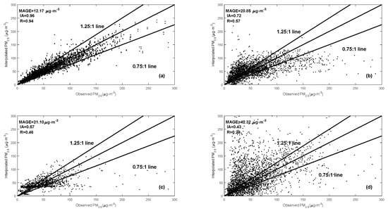 Scatter plots and performance of different methods for the 8-fold cross-validation experiments on 17–20 May 2014: (a) Performance of the 8-fold cross-validation DCIM simulations in the interpolated samples, (b) Performance of the 8-fold cross-validation DCIM simulations in the checked samples, (c) Performance of the 8-fold cross-validation kriging simulations in the checked samples, (d) Performance of the 8-fold cross-validation COPF simulations in the checked samples.