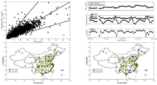 Comparison of the simulated and observed PM2.5 concentrations on 17–20 May 2014: (a) Scatter plot (µg/m3) (the 1:2, 1:1 and 2:1 lines are shown for reference), (b) Variation of spatial mean, NMB, NME and correlation (r), and spatial distribution of (c) NMB and (d) NME.