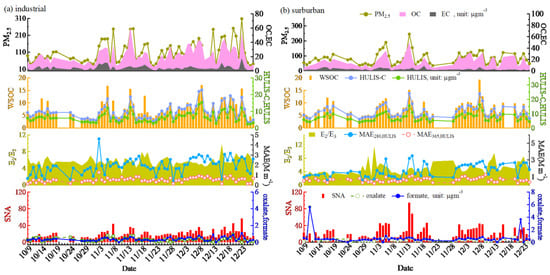 Temporal variation of PM2.5 and its constituents (i.e., HULIS-C, HULIS, OC, EC, WSOC, SNA, oxalate, and formate), as well as optical properties (E2/E3, MAE280, MAE365) of HULIS at the two sites. (a) suburban region, (b) industrial region.