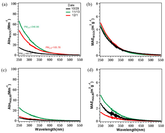 Wavelength dependences of the light absorption coefficient (Abs) (a) and mass ab-sorption efficiency (MAE) (b) for water-soluble organic carbon (WSOC), as well as Abs of the humic-like substance (HULIS) (c) and MAE of HULIS (d) in the industrial region.