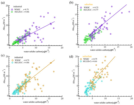 Scatter plots of Abs365 versus HULIS-C and WSOC at the two sites (a,b) and Abs340 versus HULIS-C and WSOC (c,d).