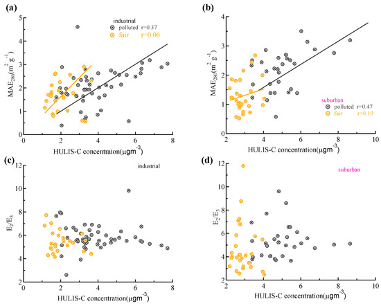 The dependences of MAE280 and the E2/E3 ratio on HULIS-C levels are shown in Figure 4. As illustrated, similar distribution patterns were found for HULIS-C MAE280 at the two sites, and both of them showed a weak positive correlation on polluted days (suburban: r = 0.47, industrial: r = 0.37). The E2/E3 value showed quite a poor or slightly negative correlation with HULIS-C concentration. Given that MAE280 and E2/E3 are linked with the chemical structure, we cannot directly obtain a clear relationship between optical characteristics and HULIS-C concentrations through our results.